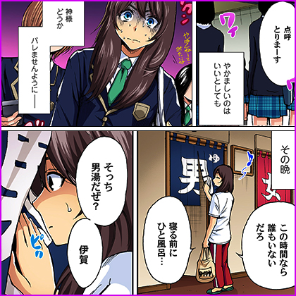 - 姉の代わりに女装して女子校の修●旅行に参加した俺。なんとか潜入したものの男だとバレたら大変な事に!?誰にも気づかれないよう、夜中の温泉にコッソリ入ろうとしたら…!?やばい!バレた!変態扱いされてしまう!!こうなったら…